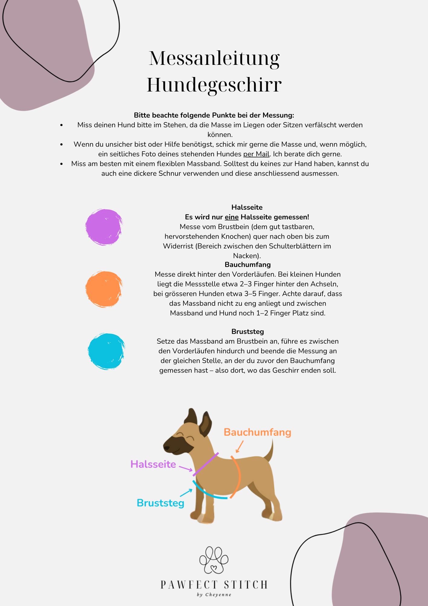 Bitte orientiere dich bei der Grössenauswahl an meiner Masstabelle und wähle die Grösse anhand des Bauchumfangs deiner Fellnase.