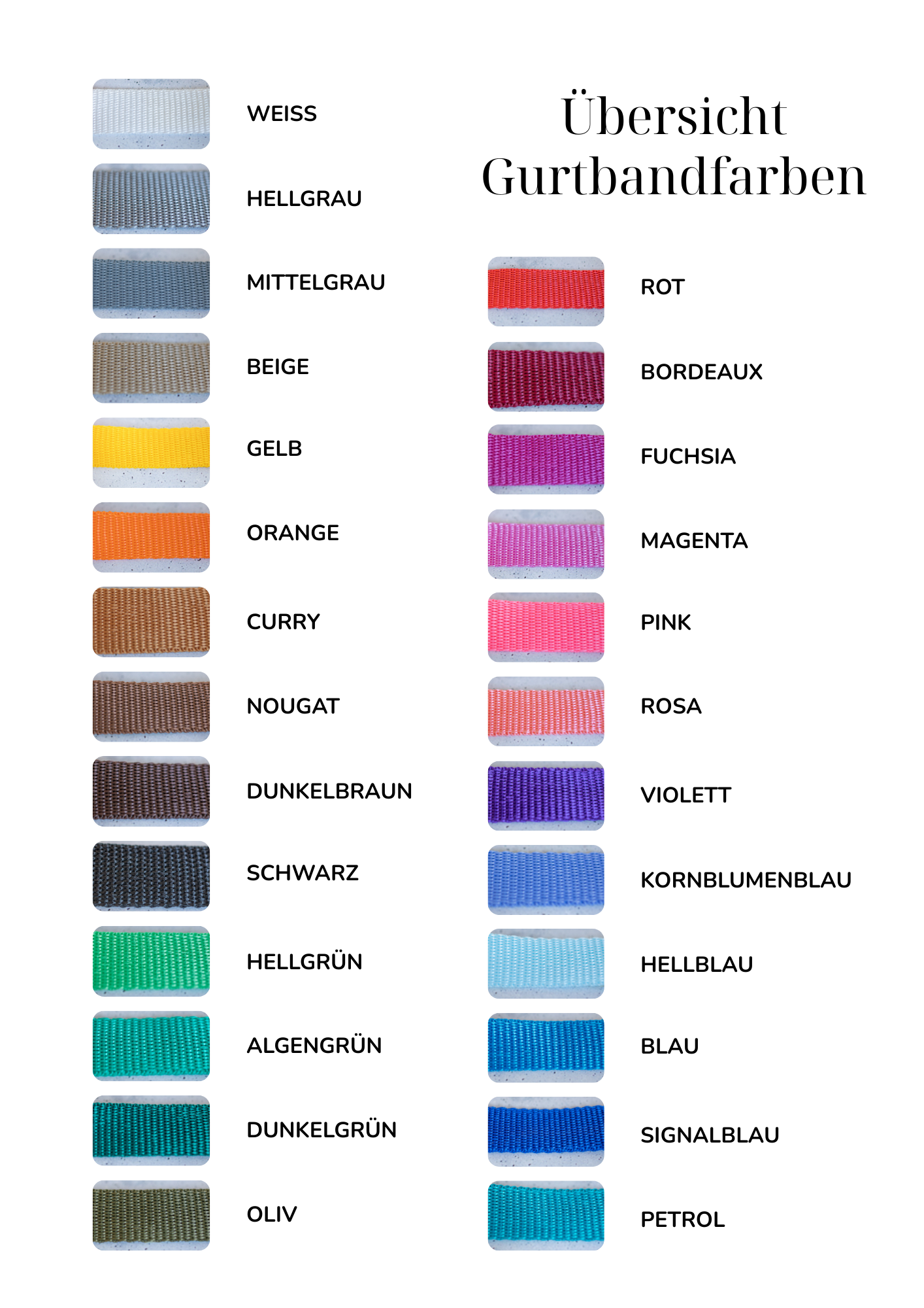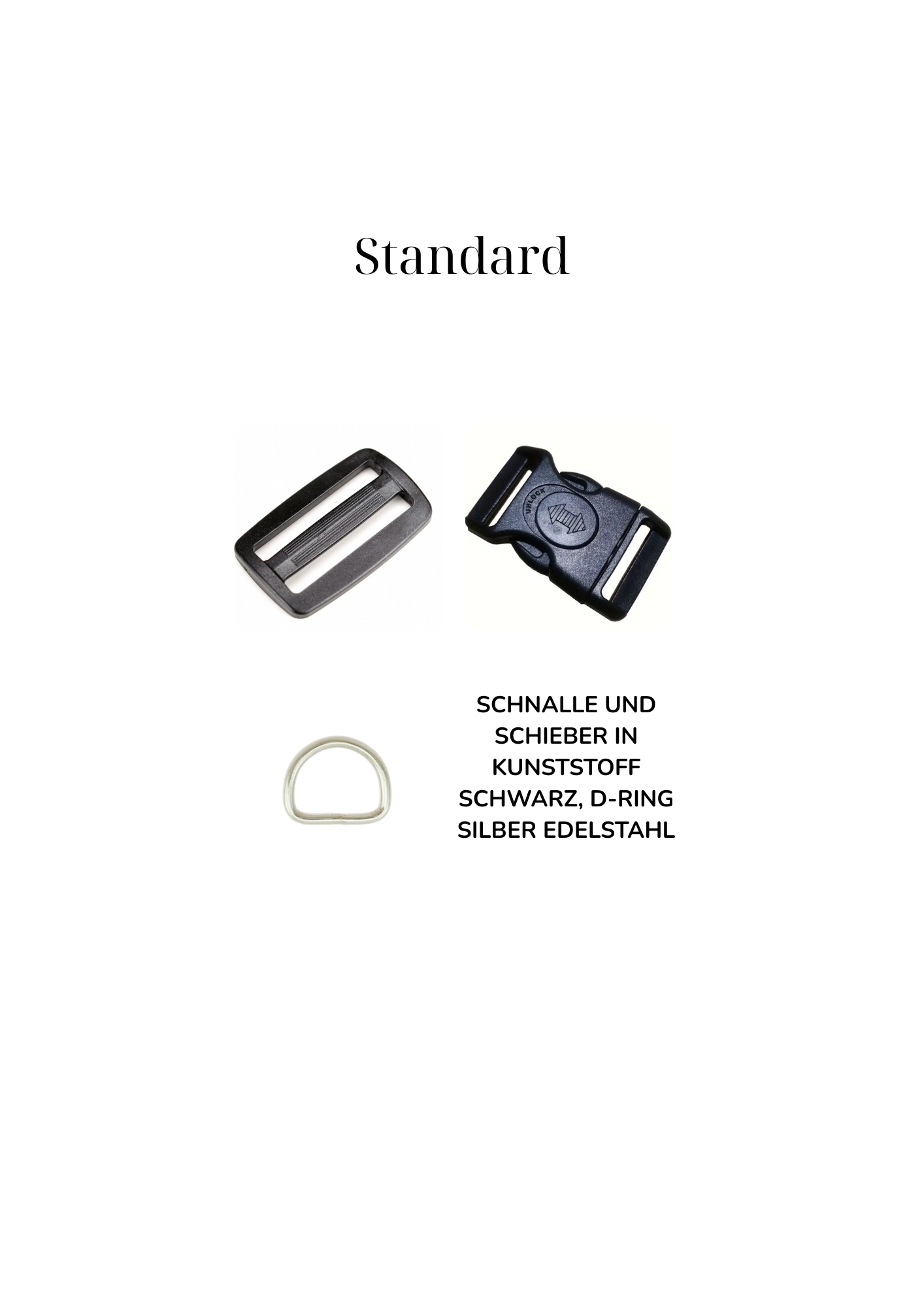 Standardmässig wird das Geschirr mit Kunststoffschnallen und -schiebern sowie Ringen aus Edelstahl gefertigt – robust, leicht und perfekt für den Alltag. Für einen edleren Look kannst du dein Geschirr mit Metallbeschlägen veredeln.
